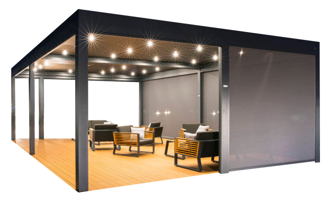 Un modello bioclimatico, in cui il tetto è costituito da lamelle in alluminio orientabili fino a 135 °. La regolazione regolare dell'angolo di inclinazione delle lamelle offre il pieno controllo sulla luce solare, consente la ventilazione naturale e la libera circolazione dell'aria
