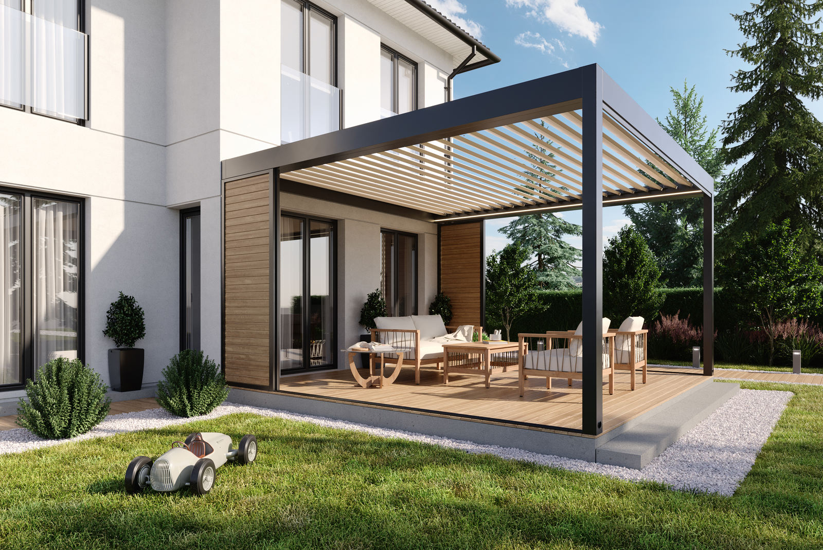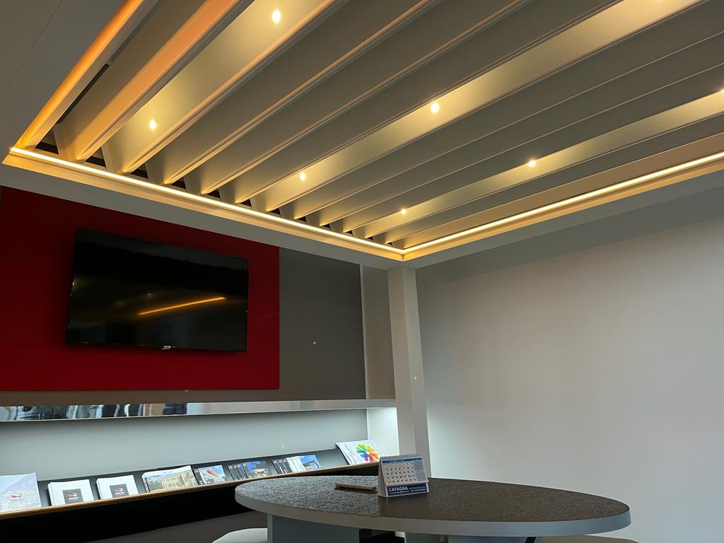Questo modello è stato anche modificato per migliorare il drenaggio della lamelle, introducendo soluzioni più avanzate per ridurre gli schizzi d’acqua, e impedire alle gocce di cadere al interno della pergola. L’impianto di drenaggio, È stato sigillato per garantire che l’acqua scaricata non sia visibile all’occhio, grazie alle zone speciali che intrappolano le goccioline nelle lamelle. Queste modifiche migliorano notevolmente il comfort di utilizzo e rendono la tettoia più resistente alle variazioni atmosferiche. Questo rende Technic Pro una costruzione quasi tutto l’anno che è più facile da installare rispetto al modello attuale, Technic
