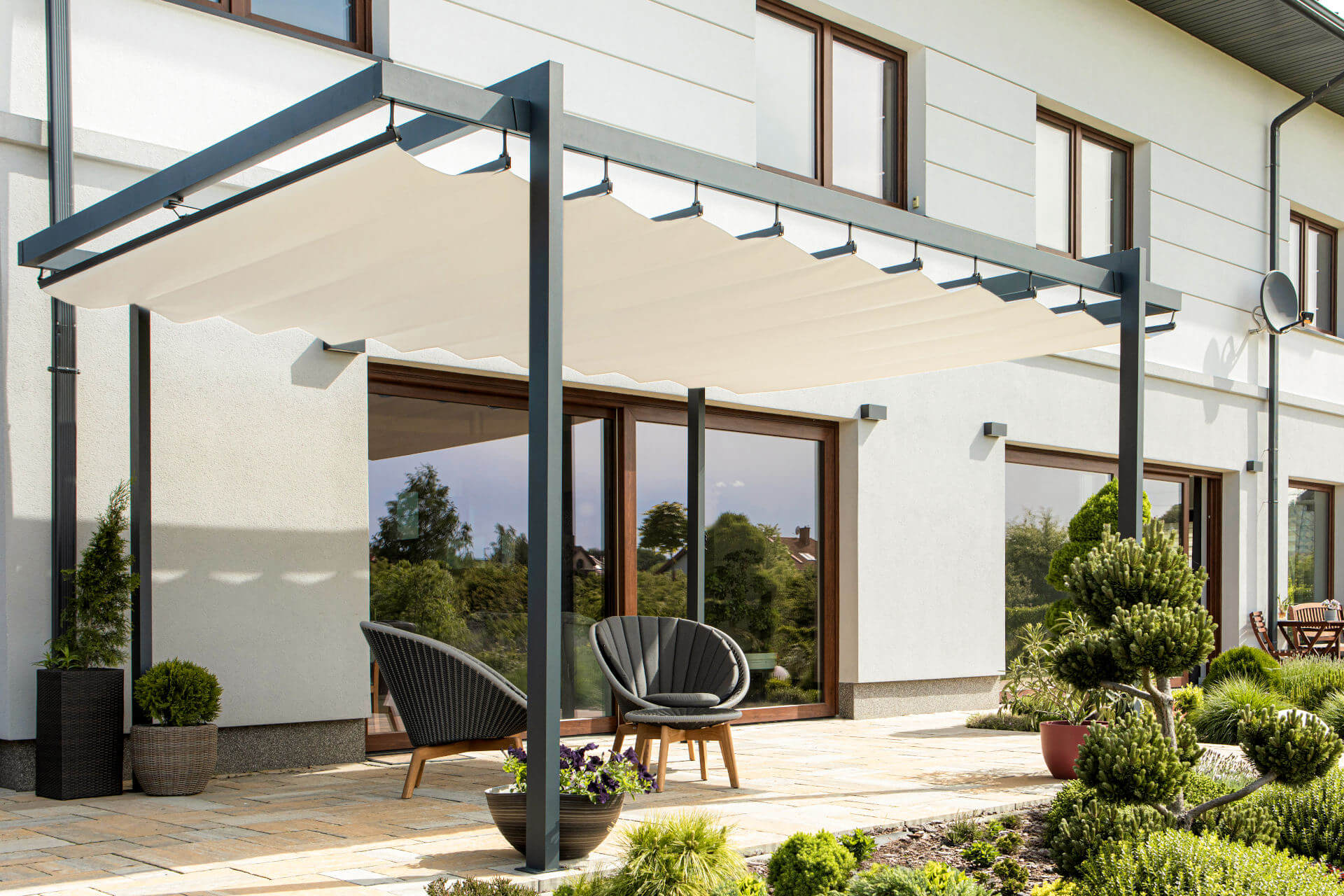 I creatori di questa versione di terrazze si sono ispirati alle pergole in legno, motivo per cui consigliamo in particolare le terrazze Wave in un colore simile al legno, che fa riferimento alle radici. Tuttavia, non ci siamo fermati al passato, ma abbiamo cercato forme contemporanee. Elementi apparentemente contraddittori, come il colore dell'alluminio e del legno, gli angoli semplici della struttura e la forma ondulata del tessuto, conferiscono in definitiva all'insieme le caratteristiche di un design moderno e originale.